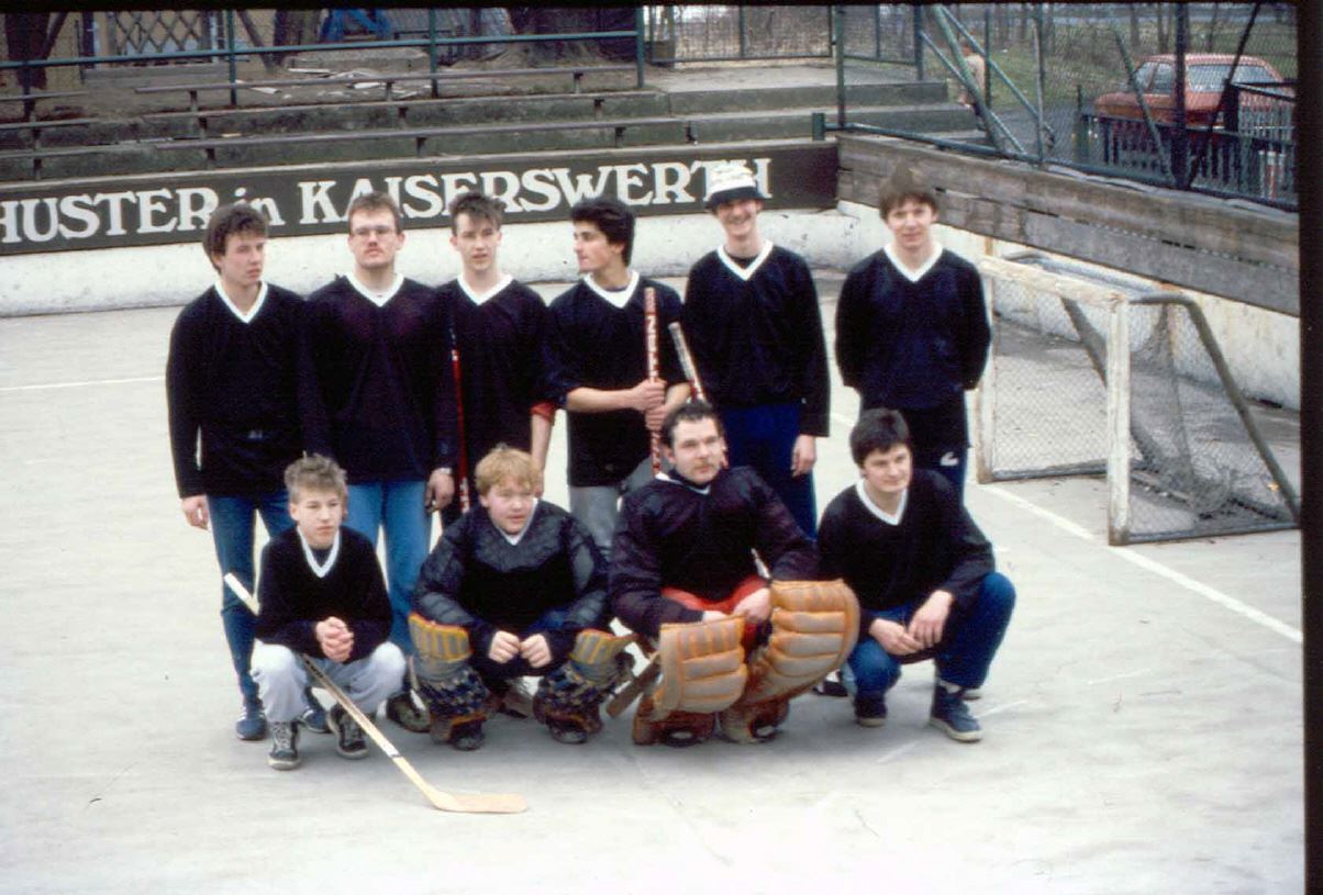 Seit 1978 spielten der 1.DEG Fan-Club und der Eishockey-Fan-Club Rot-Gelb schon auf der Rollsportanlage des Tus Nord. Viele Spiele gegeneinander und einige Turnier bildeten die Hauptaktivitäten. Etwa um die gleiche Zeit bildeten sich um das Eisstadion an der Brehmstraße auch etliche Straßenmannschaften, die es ihren Idolen von der DEG nachtun wollten. Bis zum Anfang der 80er Jahre blieben davon lediglich die Paulus Panther und die SG Zoopark über. So kam auch der Kontakt zu den Fan-Club zustande, die immer wieder nach neuen Gegnern suchten. In den Jahren 1982/83 folgten einige Freundschaftsspiele unter den vier Mannschaften, bis zu dem Entschluß kam, doch eine organisierte Meisterschaft auszurichten. So trafen sich im Oktober 1983 etwa 25 Vertreter der 4 Klubs im Krokodil auf der Mülheimer Straße, um Einzelheiten zu besprechen. Ein Spielausschuß wurde gewählt, der alles Weitere vorzubereiten hatte. Im November fanden bereits die ersten Spiele statt. Damals mußte noch im Freien bei jedem Wetter gespielt werden, was der Freunde aber keinen Abbruch tat.